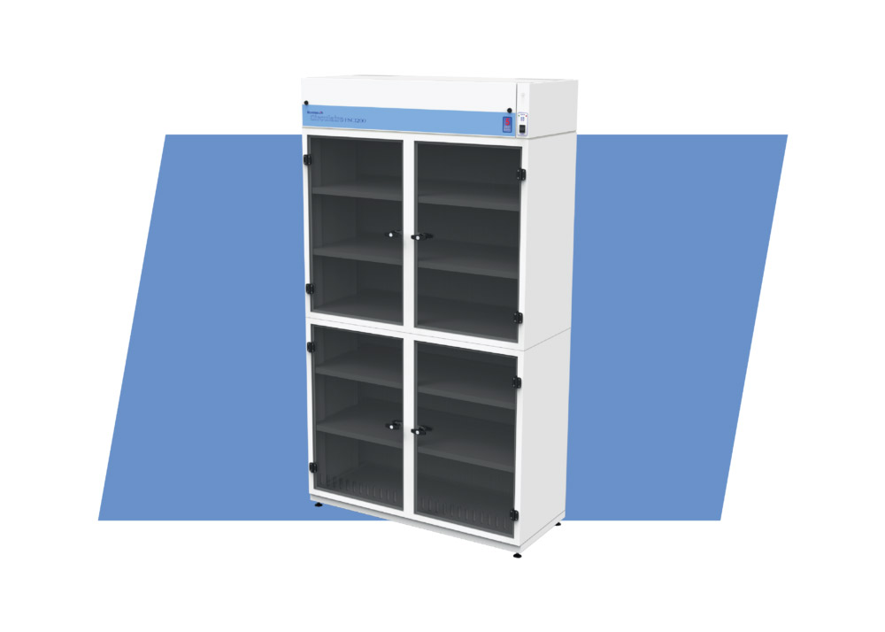 Skåpen använder recirkulerande filtrering för att ta upp gaser, ångor och övriga läckage som blivit luftburna. Distanser vid hyllplanens kanter leder läckaget direkt med cirkulationsriktningen mot det fläktförsedda toppstycket — oavsett dess naturliga rörelseriktning. Filter- och fläktlösningen meddelar användaren om filtrets mättnad med ljud och ljus. I händelse av sänkta luftflöden eller läckage kommer skåpen att larma och fortsatt arbeta runt den kontaminerade luften, även när dess filter har mättats.