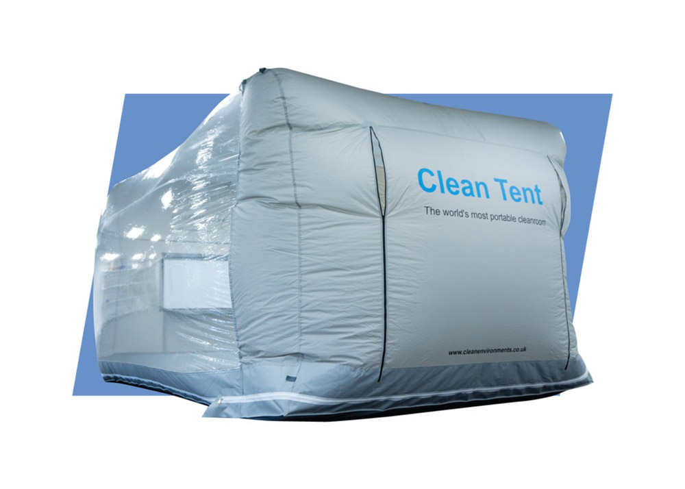 Filtrering med ULPA-filter för partikelfri miljö. Omslutande duk i PVC som skapar en luftig volym som hålls upp av kammarens övertryck. Fläkt- och filterneheten ger ett ställbart luftflöde i tältet med ren luft.